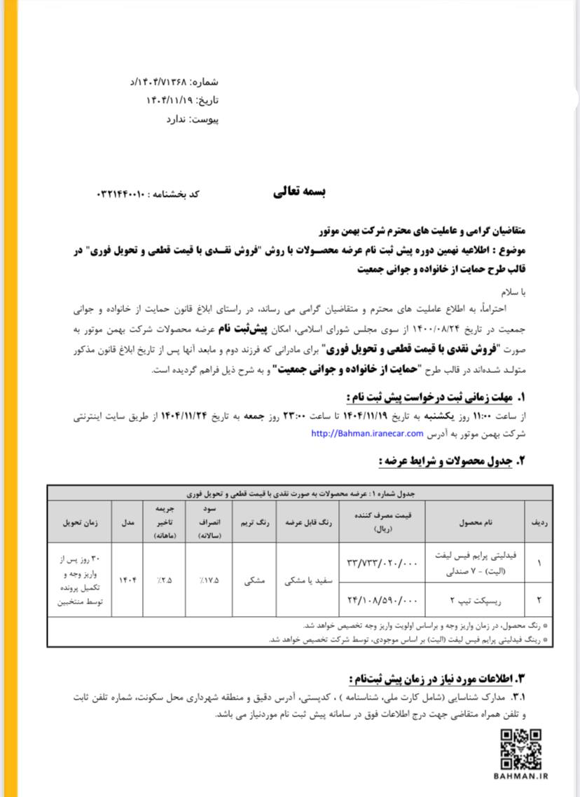 گروه بهمن موتور با انتشار یک بخشنامه جدید، شرایط فروش دو خودرو فیدلیتی پرایم فیس لیفت یا الیت و ریسپکت تیپ 2 را برای بهمن ماه 1404 اعلام کرد. کلیه علاقهمندان به خرید این 2 محصول میتوانند از ساعت 11 روز یکشنبه مورخ 19 بهمن تا ساعت 23 روز جمعه مورخ 24 بهمن، نسبت به ثبت نام و واریز وجه اقدام کنند.
