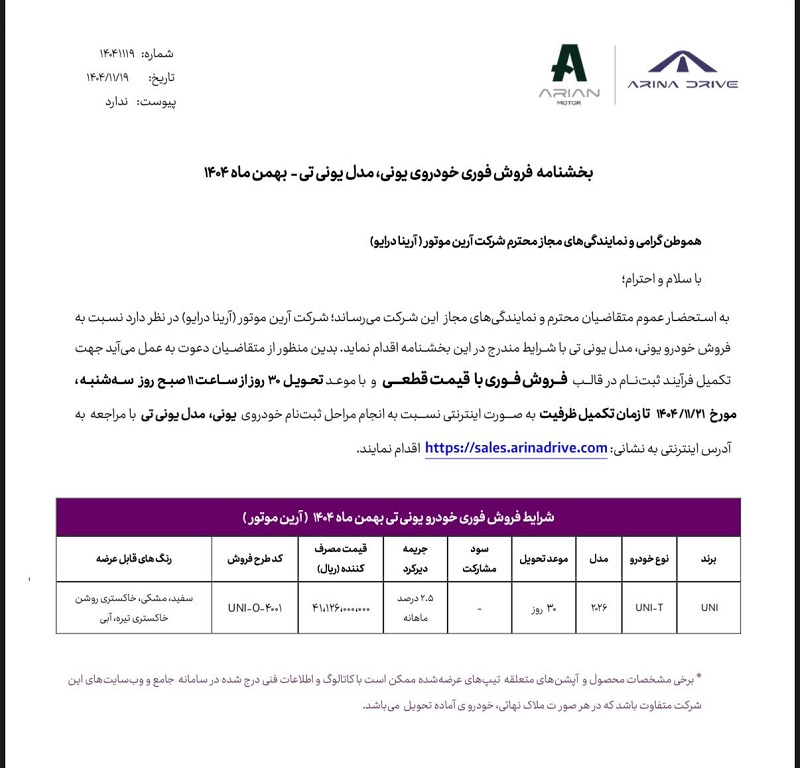 شرکت آرین موتور با انتشار یک بخشنامه جدید، شرایط فروش کراس اوور چانگان یونی تی مدل 2026 را برای بهمن ماه 1404 اعلام کرد. کلیه علاقهمندان به خرید این خودرو میتوانند با قیمت قطعی از ساعت 11 صبح روز سه شنبه مورخ 21 بهمن تا زمان تکمیل ظرفیت، نسبت به ثبت نام و واریز وجه اقدام کنند.