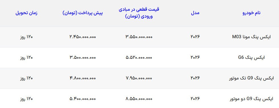 شرکت ایکس موتورز با انتشار یک بخشنامه جدید، قیمت و شرایط فروش 4 محصول خود را برای بهمن ماه 1404 اعلام کرد. کلیه علاقهمندان به شرکت در این طرح، میتوانند به نشانی این شرکت XMotorsco.com مراجعه کنند. خودروهای ایکس پنگ مونا M03، ایکس پنگ G6، ایکس پنگ G9 تک موتور و ایکس پنگ G9 دو موتور در طرح پیش رو به فروش میرسند.