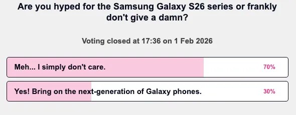 بر اساس نظرسنجی انجامشده توسط وبسایت TechRadar، اکثریت قریب به اتفاق کاربران (۷۰ درصد) اظهار کردهاند که نسبت به سری سامسونگ گلکسی S26 هیجانزده نیستند. این در حالی است که تنها ۳۰ درصد از پاسخدهندگان به این گوشیهای پرچمدار آتی علاقهمند هستند. کارشناسان معتقدند این بیتفاوتی از ماهیت تکراری بهروزرسانیها در این سری از گوشیهای سامسونگ نشأت میگیرد؛ جایی که بیشتر پیشرفتها روی بخش نرمافزار و قابلیتهای Galaxy AI متمرکز شدهاند و خبری از نوآوریهای سختافزاری چشمگیر نیست.