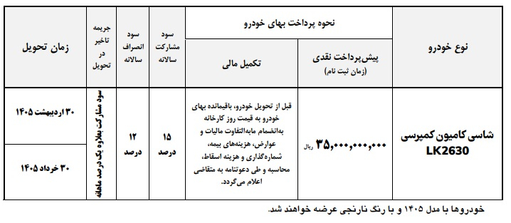 بر اساس طرح فروش جدید ایران خودرو دیزل، کامیون کمپرسی مدل LK2630 در مرحله جدید عرضه خواهد شد و مبلغ 3 میلیارد و 500 میلیون تومان بهعنوان پیشپرداخت نقدی در زمان ثبتنام تعیین شده است. همچنین پرداخت مابقی وجه خودرو پیش از تحویل، بر اساس اطلاعات مالی، بیمه، عوارض و سایر هزینههای جانبی محاسبه و به خریدار اعلام میشود.
