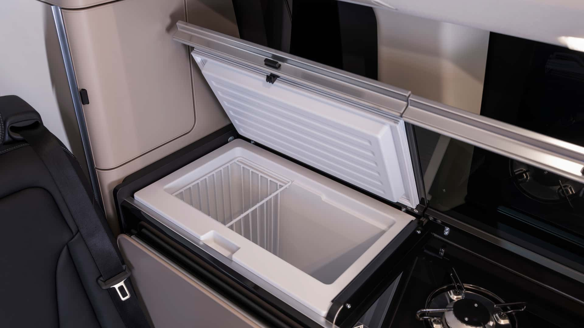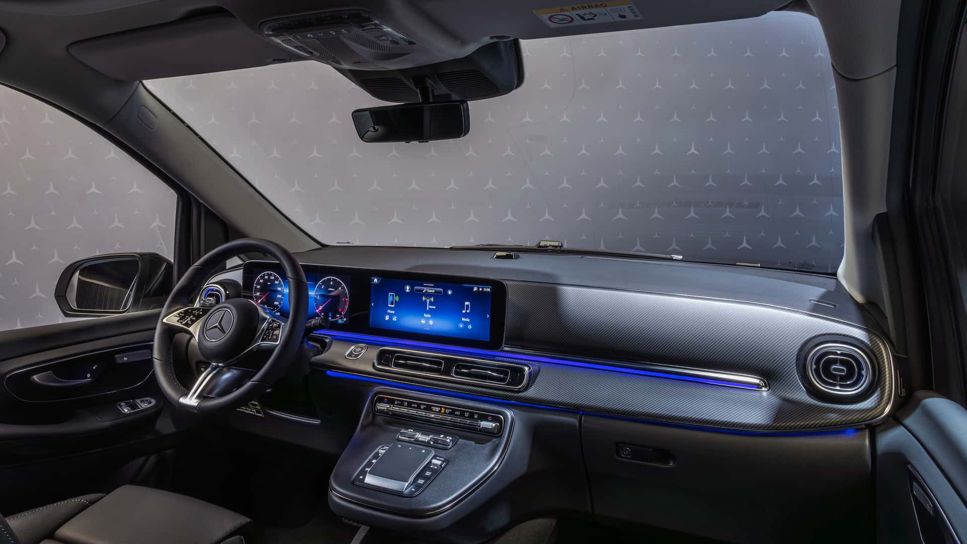 داخل کابین نیز فضای دیجیتال و لوکس بیش از پیش چشمگیر است. دو نمایشگر تمامدیجیتال ۱۲.۳ اینچی با آخرین نسخه سیستم هوشمند MBUX نهتنها وظیفه کنترل ناوبری و اطلاعات را بر عهده دارند، بلکه تمام عملکردهای مرتبط با زندگی کمپینگ را از نورپردازی تا تنظیم تختها و سیستم صوتی را کنترل میکنند. در بخش داخلی، آشپزخانه کوچک اما کاربردی با امکانات کامل شامل سینک، اجاق و فضای ذخیرهسازی بازطراحی شده تا استفاده هوشمندانهتری از فضا ممکن شود.