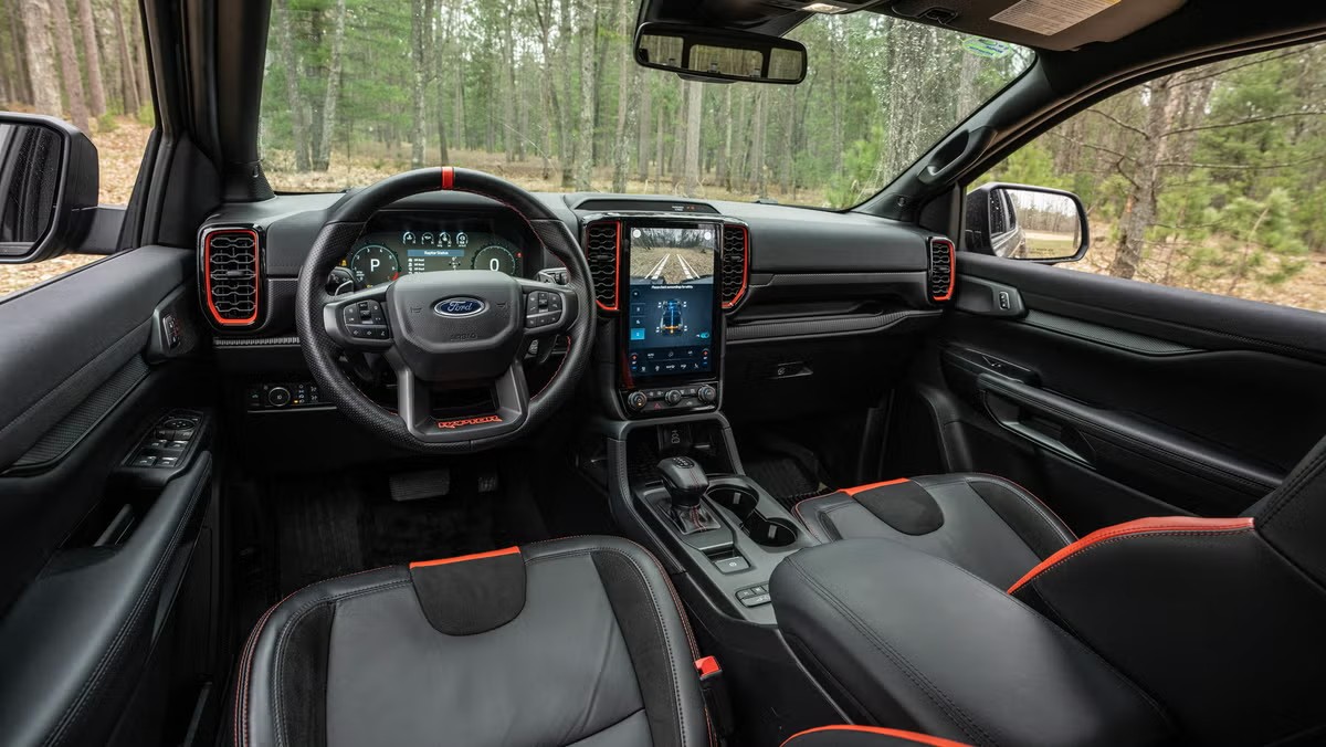 فضای داخلی فورد رپتور ۲۰۲۶ ترکیبی از استحکام و راحتی را ارائه میدهد. مواد بادوام و صندلیهای حمایتی برای استفادههای خارج از جاده مناسب هستند، در حالی که امکانات پریمیوم برای رانندگی روزمره نیز در نظر گرفته شده است. سیستم اطلاعات و سرگرمی شامل یک صفحه نمایش لمسی بزرگ با پشتیبانی از Apple CarPlay و Android Auto، مسیریابی و نظارت بر عملکرد آفرود است.