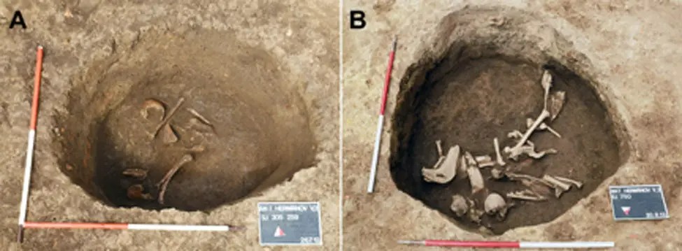 از میان این سه اسکلت، تنها یکی از آنها که ریشههای اروپای غربی داشت، جمجمهای با شکل طبیعی داشت. اسکلت دوم که متعلق به فردی با ریشههای آسیای شرقی بود، دارای کشیدگی مایل به سمت بالا بود. اسکلت سوم نیز که ریشههای آسیای نزدیک داشت، تغییر شکل دایرهای-قائم را نشان میداد که در آن پشت پیشانی صاف شده و ارتفاع جمجمه بهشکل چشمگیری افزایش یافته بود. این نوع تغییر شکل عمدی جمجمه در دوره مهاجرت (قرون ۴ تا ۷ پس از میلاد) بهویژه در میان اقوام کوچنشین مانند هونها بسیار رایج بوده است.
