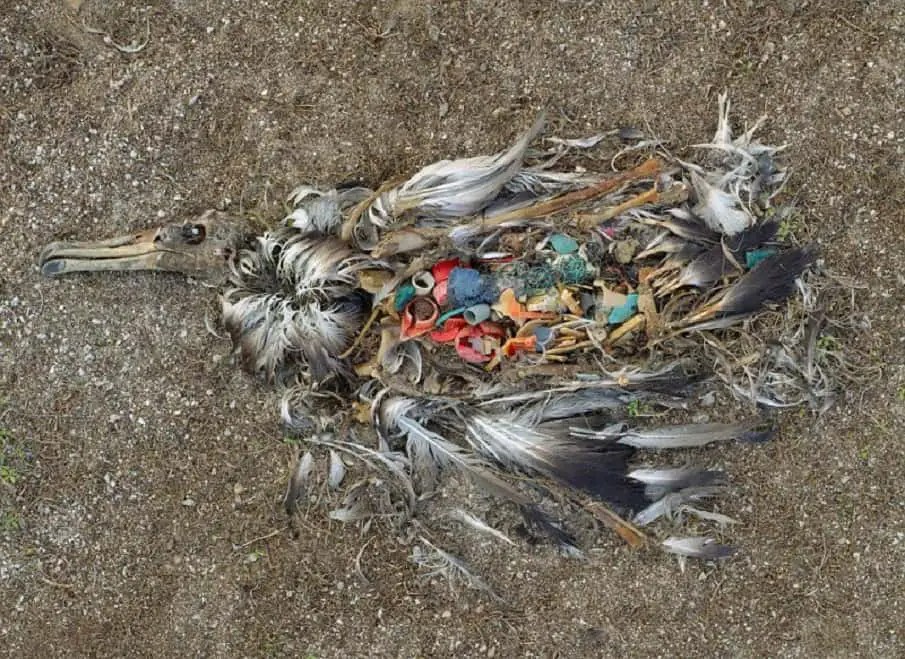 تصویر یک آلباتروس که درون بدنش مملو از پلاستیک است، پیامد مهلک آلودگی پلاستیک بر پرندگان دریایی را نشان میدهد.