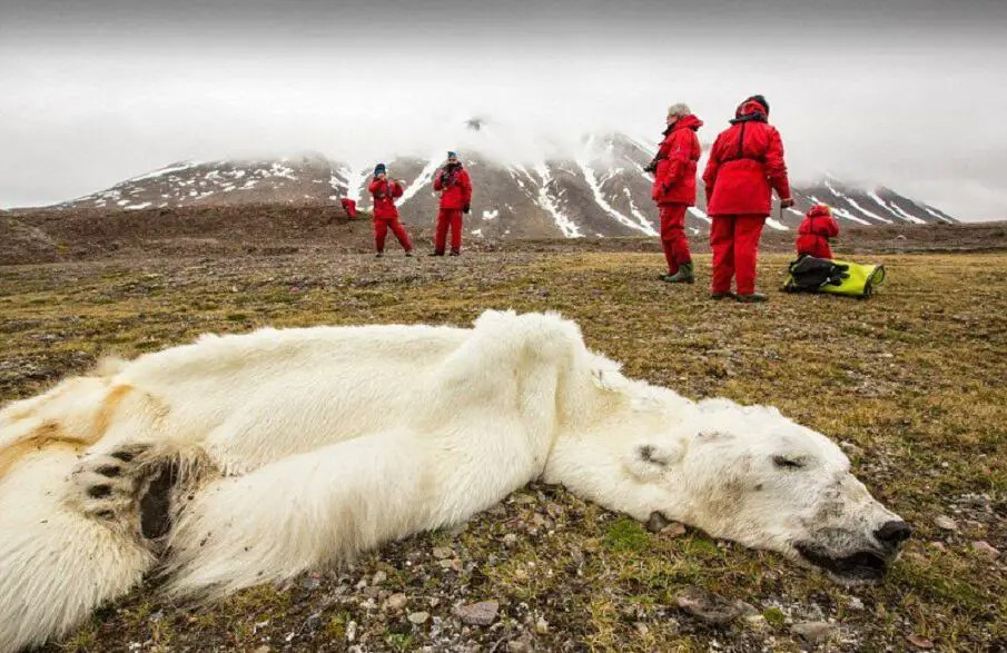 تصویر یک خرس قطبی تلف شده از گرسنگی، شاهدی بر تاثیر ذوب شدن یخها و تغییر اکوسیستمها بر حیات وحش است.