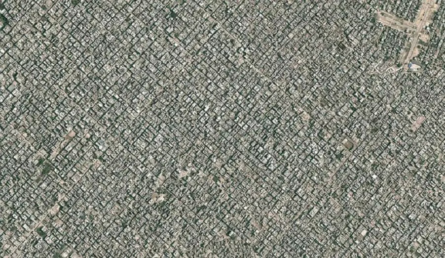 نمای ماهوارهای دهلی نو در هند، سومین کلانشهر بزرگ جهان، رشد بیرویه شهرنشینی و گسترش مناطق مسکونی را به تصویر میکشد.