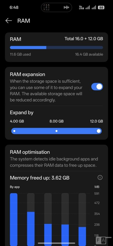 این گوشی دارای یک سیستم خنککننده وسیع با مساحت ۳۶,۳۴۴.۴ میلیمتر مربع است که از محفظه بخار و ژل حرارتی استفاده میکند. در تستهای بازیهای سنگین مانند COD و BGMI، هیچ مشکلی در افت فریم مشاهده نشد.