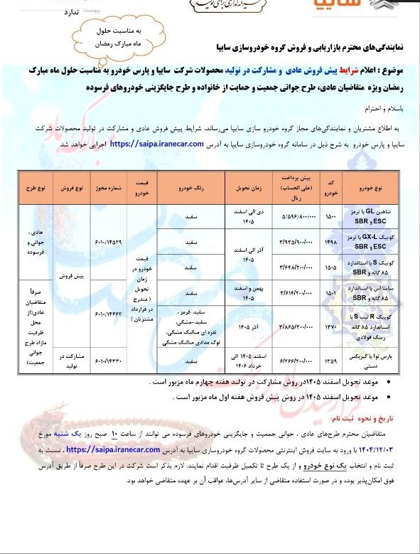 - شرایط پیش فروش محصولات سایپا ویژه ماه رمضان 1404