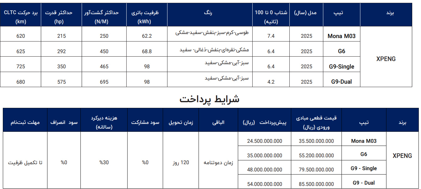 نسخه تکموتوره ایکس پنگ G9 در این بخشنامه ۷ میلیارد و ۹۵۰ میلیون تومان قیمتگذاری شده است و مبلغ ۴ میلیارد و ۸۰۰ میلیون تومان بهعنوان پیشپرداخت در نظر گرفته شده است. در نهایت، نسخه دوموتوره XPENG G9 بهعنوان مدل پرچمدار، با قیمت ۸ میلیارد و ۵۵۰ میلیون تومان عرضه میشود و میزان پیشپرداخت آن ۵ میلیارد و ۴۰۰ میلیون تومان تعیین شده است.