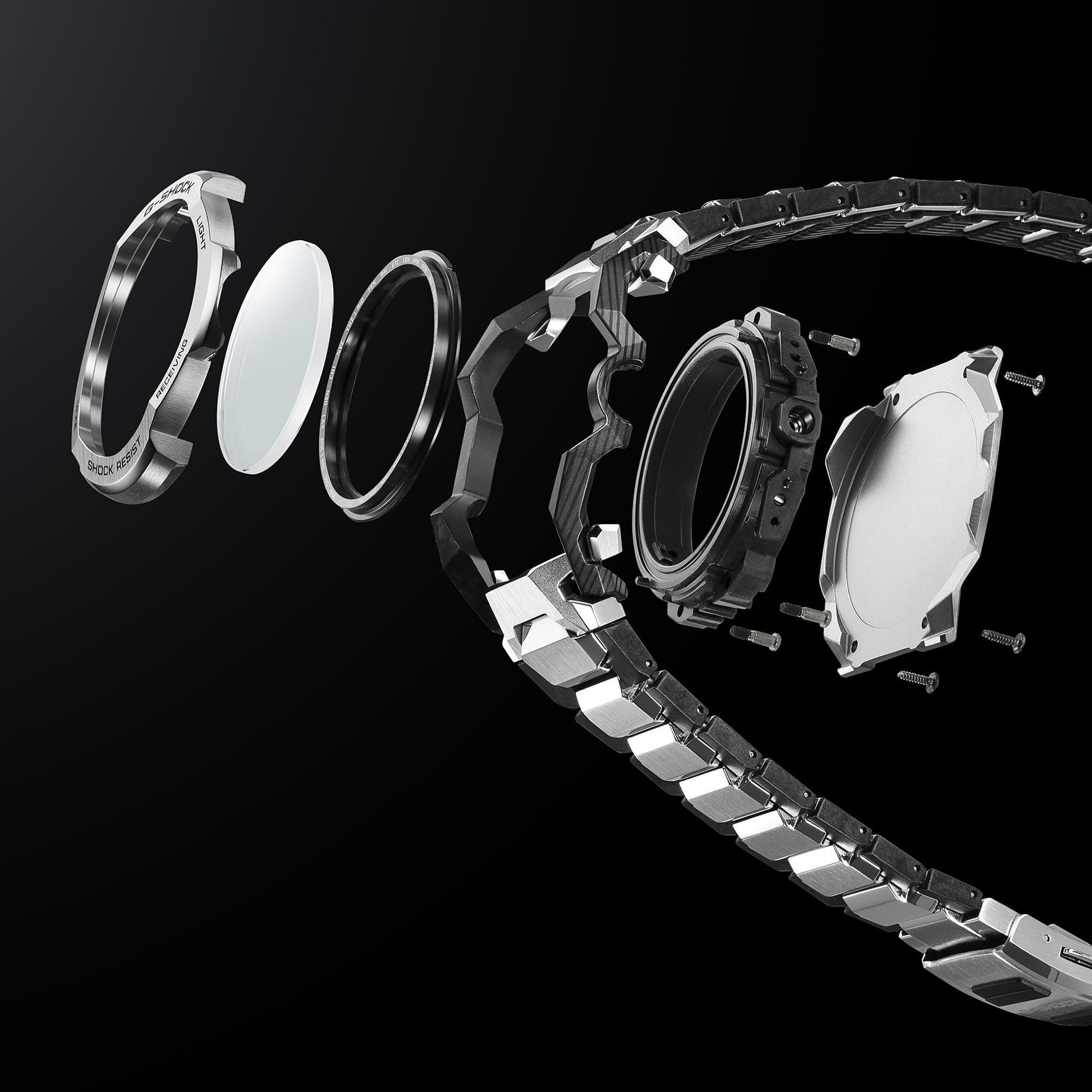 ساعت جدید کاسیو از ساختار Dual Core Guard برخوردار است که شامل فیبر کربن و استیل ضدزنگ میشود. قاب دو لایه استیل و بند ترکیبی استیل-رزین تقویتشده با کربن، استحکام و سبکی میبخشند. صفحه توسط شیشه سافایر ضد انعکاس محافظت میشود. ابعاد ۵۶.۶ در ۴۵.۳ در ۱۴.۴ میلیمتر و وزن ۱۷۸ گرم است.