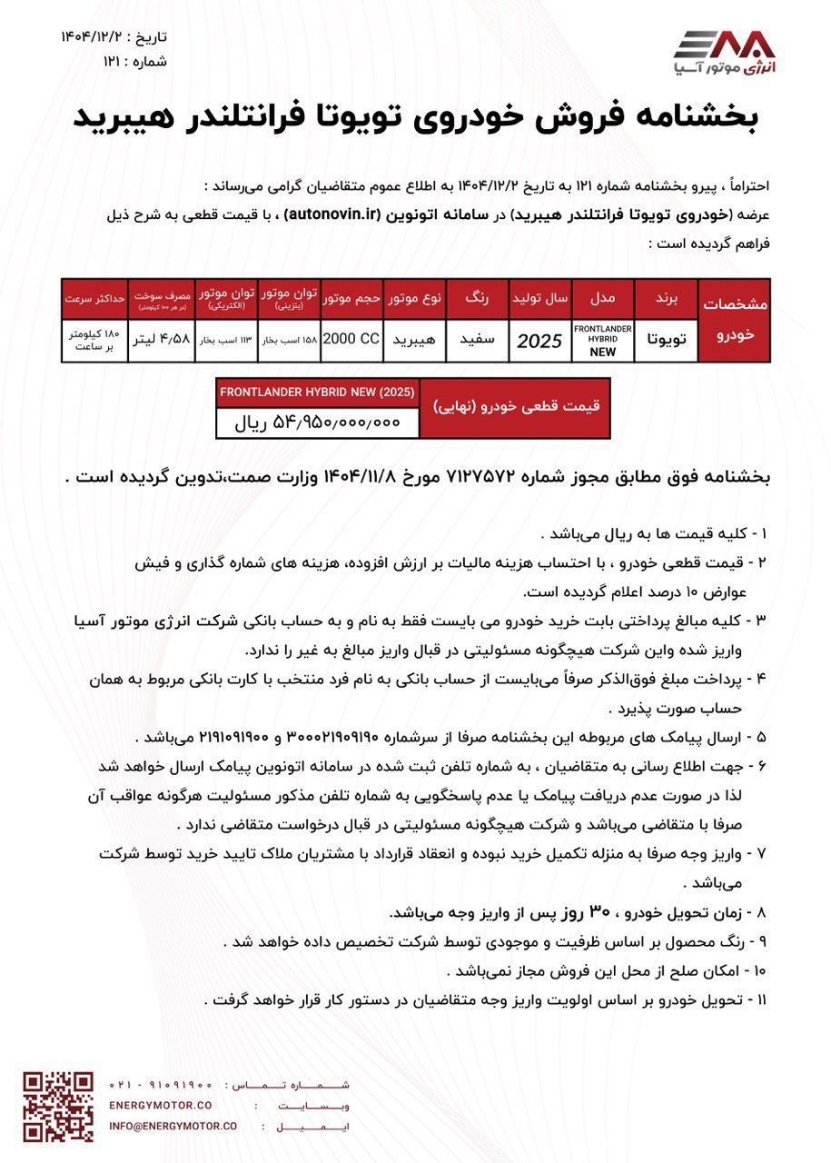 شرکت انرژی موتور آسیا با انتشار بخشنامه 3 خودرو وارداتی از برند تویوتا، شرایط فروش تویوتا راو 4 تک دیفرانسیل، تویوتا کرولا 1.8 هیبریدی و تویوتا فرانتلندر هیبریدی را برای اسفندماه 1404 اعلام کرد.