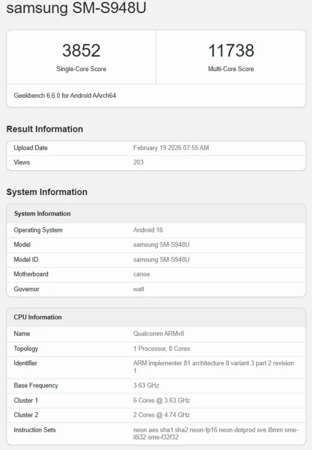 تنها چند روز مانده به رویداد بزرگ آنپکد سامسونگ، نتایج بنچمارک گلکسی S26 اولترا در پایگاه داده گیکبنچ ۶ فاش شده که نشاندهنده جهشی عظیم در قدرت پردازشی این گوشی است. بر اساس این لیست، پرچمدار آینده سامسونگ موفق به کسب امتیاز تکهستهای ۳۸۵۲ و امتیاز چندهستهای خیرهکننده ۱۱۷۳۸ شده است. به نظر میرسد بهینهسازی اختصاصی تراشه اسنپدراگون برای سری گلکسی، نتیجهای فراتر از انتظار به همراه داشته است.