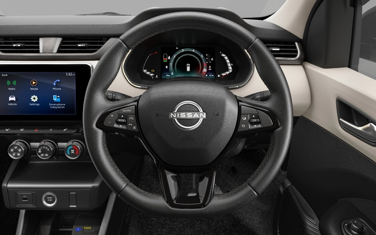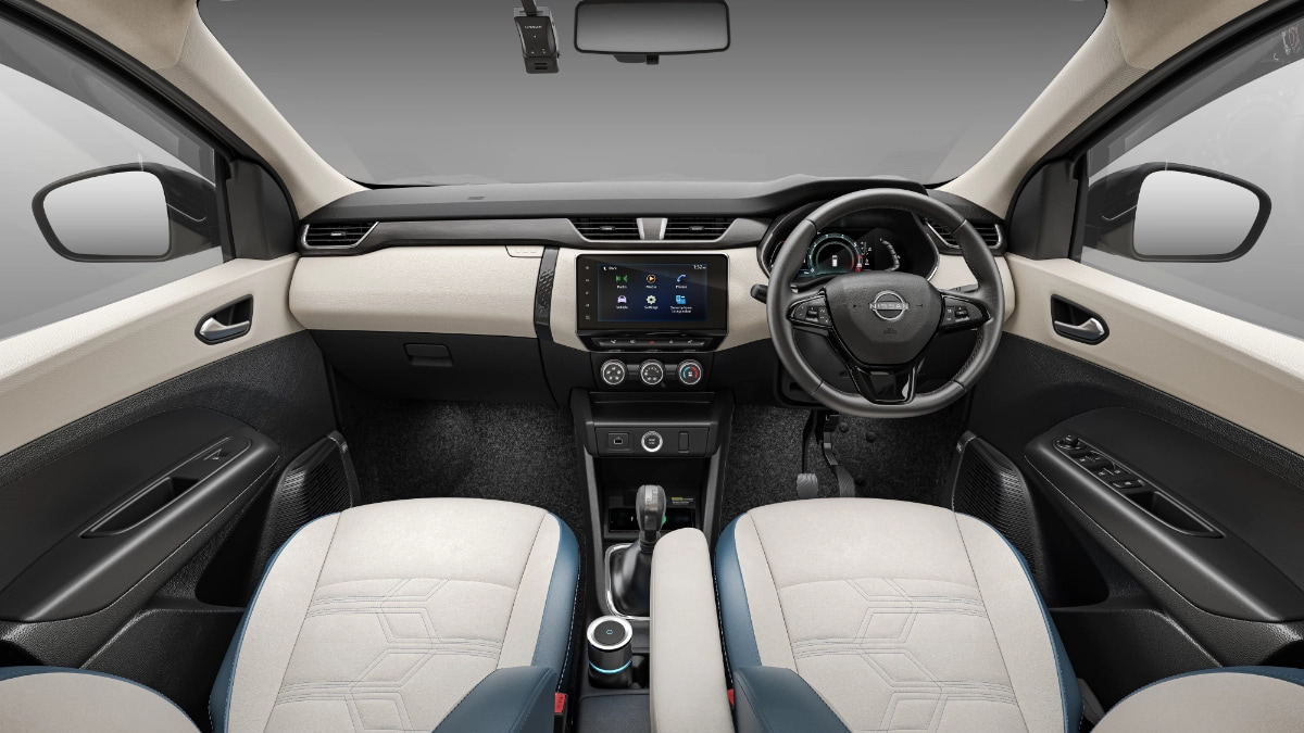 طراحی کابین تا حد زیادی با ترایبر مشترک است، اما نیسان تلاش کرده با افزودن جزئیاتی تازه، محیطی مدرنتر و جذابتر رقم بزند. داشبورد دو رنگ با تزئینات نقرهای اطراف دریچههای تهویه، حس لوکستری القا میکند. در مدلهای فولآپشن، خودرو مجهز به نمایشگر لمسی ۸ اینچی برای سیستم چندرسانهای با پشتیبانی از اندروید اتو و اپل کار پلی و صفحه آمپر دیجیتال ۷ اینچی برای نمایش اطلاعات رانندگی است.