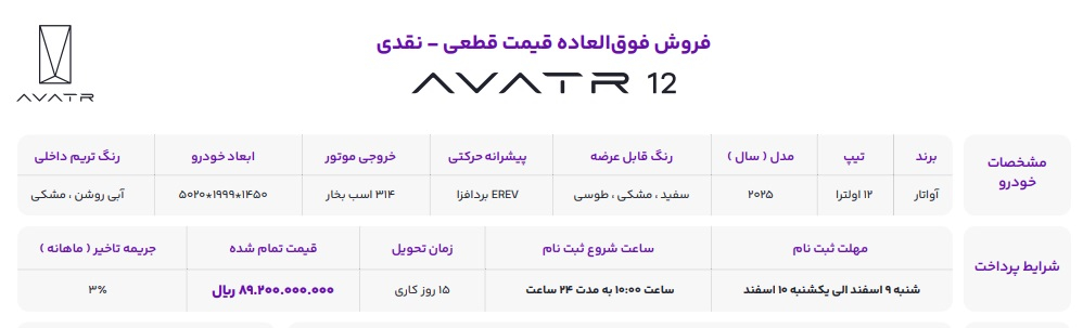 شرکت آوا موتور پارس در اطلاعیه جدید خود قیمت رسمی سدان آواتار ۱۲ را ۸ میلیارد و ۹۲۰ میلیون تومان اعلام کرده است. بر اساس شرایط فروش منتشرشده، این خودرو با تحویل ۱۵ روز کاری پس از تکمیل ثبتنام عرضه میشود. همچنین شرکت برای حفظ حقوق خریداران، جریمه تأخیر ماهانه ۳ درصد در نظر گرفته است. لازم به ذکر است این مرحله از فروش با ظرفیت محدود اجرا میشود.