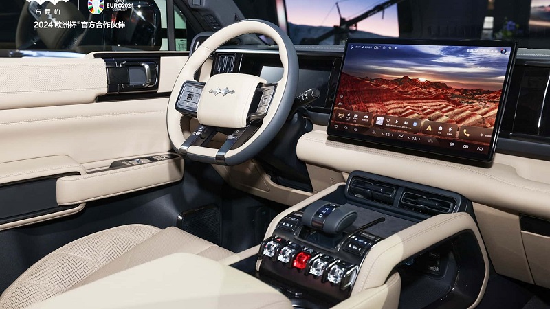 پیرو طراحی هنرمندانه و کاربردی بدنه، فضای کابین لئوپارد 5 نیز تلفیقی از زیبایی و کاربردی بودن است. وقتی وارد کابین میشوید، کمتر احساس یک خودرو سخت جان و آفرودی منتقل میشود. استفاده از المانهای افقی در داخل به همراه صفحهنمایشهای بزرگ، فضایی نوآورانه و مدرن ایجاد کرده و این حس و حال با زبان طراحی محکم و استوار بی وای دی ترکیب شده است.