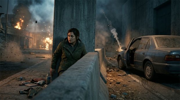 - بنشین (Drop): بلافاصله زانو بزنید یا روی زمین دراز بکشید. این کار شما را از افتادن یا پرتاب شدن در اثر موج انفجار محافظت میکند. روی شکم دراز کشیدن و دستها را روی سر قرار دادن، بهترین حالت است.