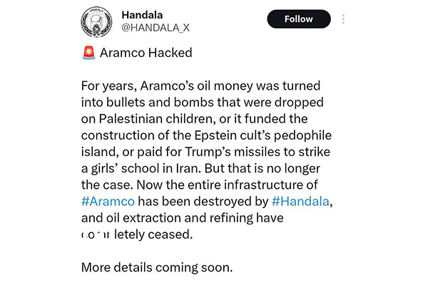 بر اساس گزارشهای منتشر شده، یک گروه هکری با نام حنظله (Hanzaleh) مدعی شده است که موفق به نفوذ گسترده به سرورهای شرکت نفت و گاز عربستان سعودی یا همان آرامکو (Aramco) شده است. این گروه در بیانیههای خود ادعا میکند که توانسته فرآیندهای کلیدی از جمله استخراج نفت خام و عملیات پالایشگاهی را به طور کامل فلج کند.