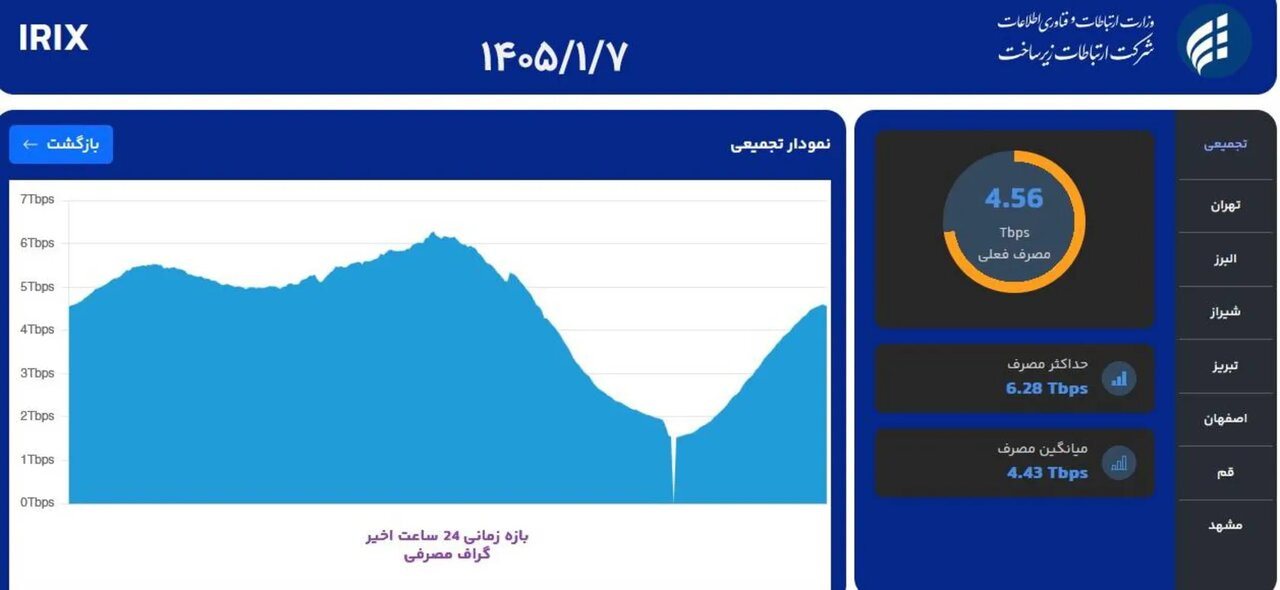 بررسی آمارها از افت محسوس مصرف ترافیک دیتا در زمان اختلال اینترنت حکایت دارد. میزان ترافیک ثبتشده کمتر از حد معمول بوده و از مرز ۴.۵ ترابیت عبور نکرده است.