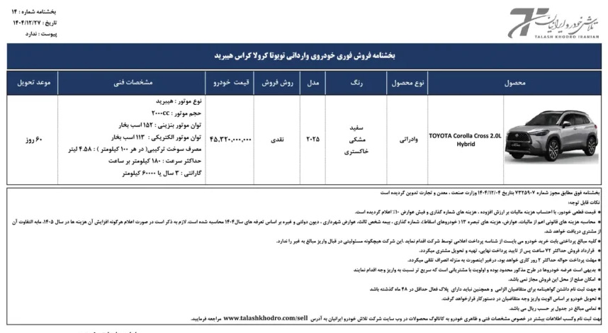 تلاش خودرو ایرانیان فروش تویوتا کرولا کراس هیبرید مدل ۲۰۲۵ را با قیمت ۴۵ میلیارد و ۳۲۰ میلیون ریال آغاز کرد. ثبتنام از ۱۵ فروردین شروع میشود و تحویل خودروها طی ۶۰ روز انجام خواهد شد.