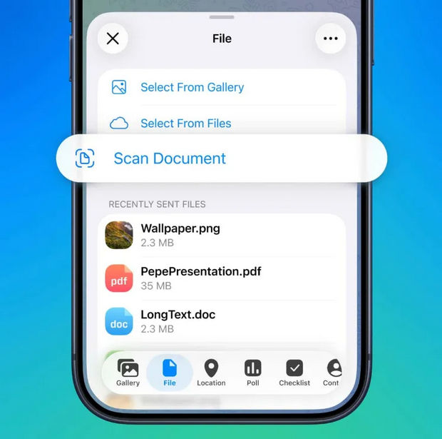 کاربران iOS اکنون میتوانند اسناد کاغذی را مستقیماً در تلگرام اسکن و در قالب یک فایل واحد ذخیره کنند. ابزار داخلی برنامه بهصورت خودکار تصویر را اصلاح و به فایل PDF تبدیل میکند و امکان ویرایش دستی نیز وجود دارد.