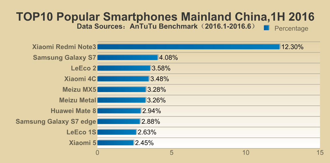 طبق دیتای جمع آوری شده توسط سرویس انتوتو از ژانویه تا ژوئن 2016، گلکسی نوت 5 با 7.82 درصد سهم در رده اول محبوب ترین گوشی های نیمه اول سال قرار می‌گیرد. سه جایگاه بعدی محبوب ترین گوشی های نیمه اول سال نیز در اختیار محصولات سامسونگ قرار دارد و گلکسی اس 6، گلکسی اس 6 اج و گلکسی اس 7 به ترتیب جایگاه‌های دوم تا چهارم را به خود اختصاص داده‌اند. بنابراین تسلط تلفن‌های هوشمند کمپانی سامسونگ بر بازار جهانی این بخش غیر قابل انکار است. با این حال به نظر می‌رسد در بازار چین، کمپانی شیائومی توانسته است با ردمی نوت 3 (Xiaomi Redmi Note 3) موفقیت بزرگی به دست آورد و 12.30 درصد از سهام بازار را به خود اختصاص دهد. بعد از ردمی نوت 3، گلکسی اس 7 سامسونگ با 4.08 درصد در رده دوم قرار دارد. LeEco 2 و شیائومی 4 سی به ترتیب در جایگاه سوم و چهارم قرار دارند.