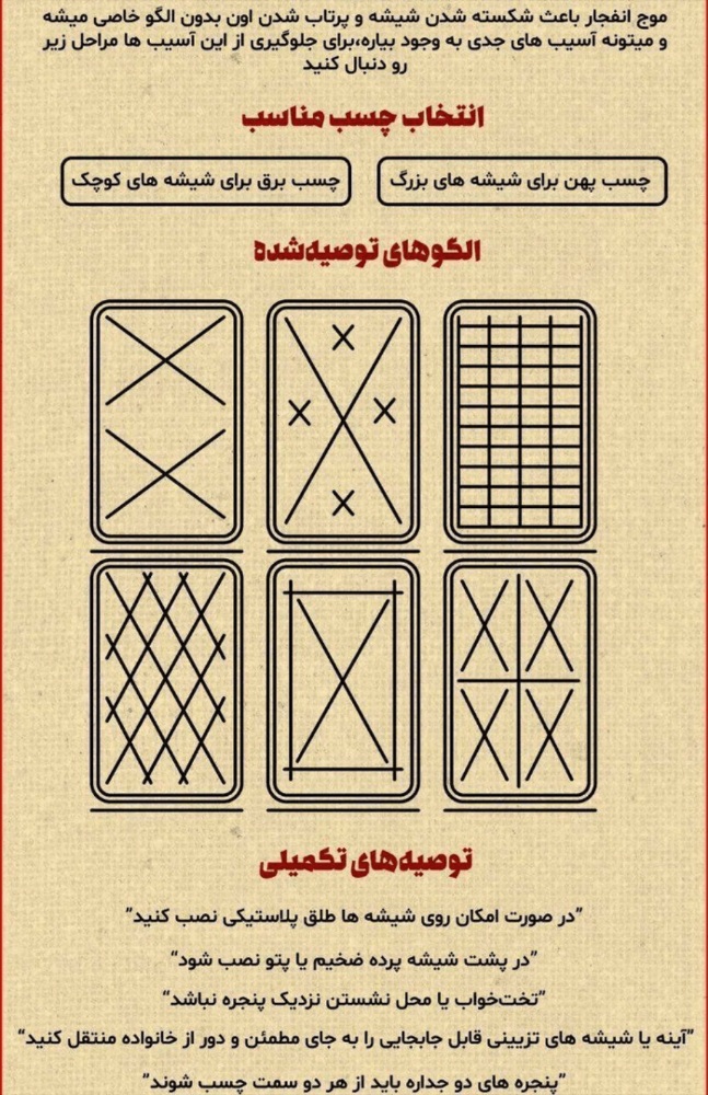 بررسیها نشان میدهد روشهایی مانند چسب ضربدری یا ترکیب چسب با پتو و پارچه نیز در هیچیک از استانداردهای رسمی ایمنی بهعنوان راهکار معتبر ثبت نشدهاند. پتو ممکن است بخشی از خردهشیشهها را مهار کند، اما بههیچوجه قابل اتکا نیست.