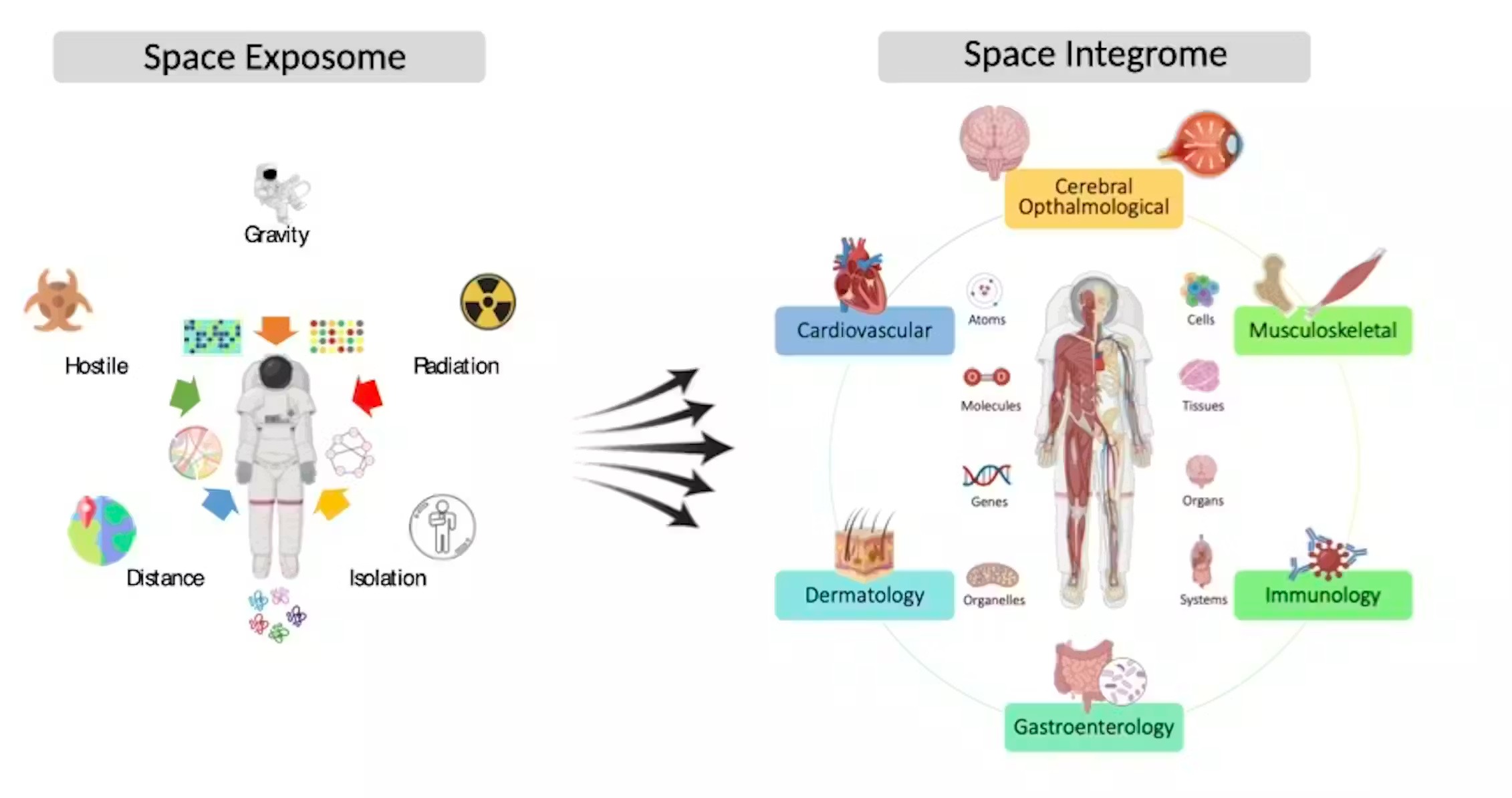 حضور خارج از میدان مغناطیسی محافظ زمین، قرار گرفتن در معرض پرتوهای فضایی را افزایش داده که میتواند به DNA آسیب رسانده، عملکرد سیستم ایمنی را مختل کند و بر مغز و قلب و عروق تأثیر بگذارد.