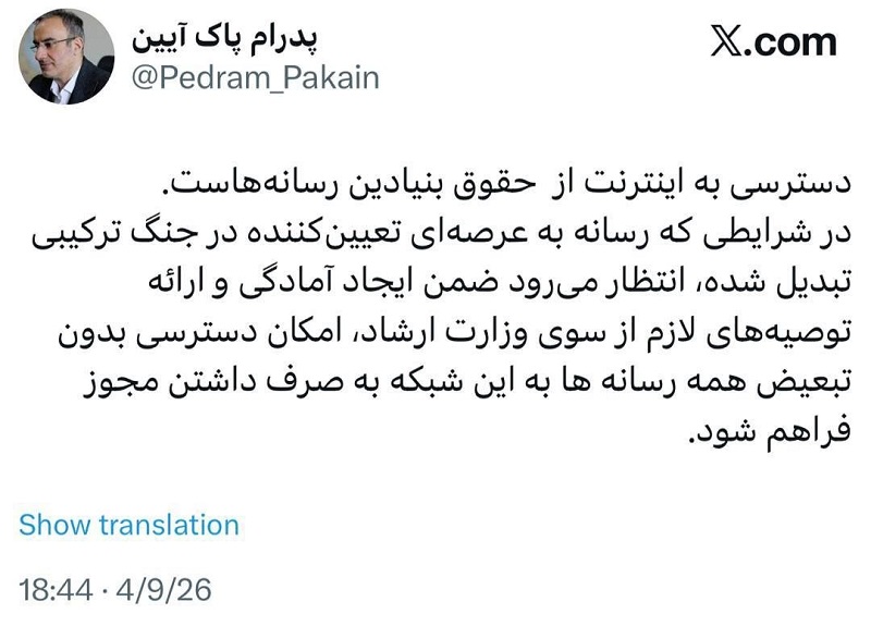 با این حال، رسانهها که از زمان آغاز جنگ تا به امروز در خط مقدم نبرد بوده و تمام تلاش خود را برای بازتاب اندیشهها و اخبار موثق جنگ کردهاند، شایسته بهرهمندی از اینترنت بین الملل به منظور فعالیت آزادانهتر در دنیای رسانه هستند. نمیتوان دست و پای رسانهها را بست و به آنها گفت که باید فعالیت خود را مشتاقانه و دقیق انجام دهید. آقای پاک آیین در شبکه اجتماعی ایکس نوشت: