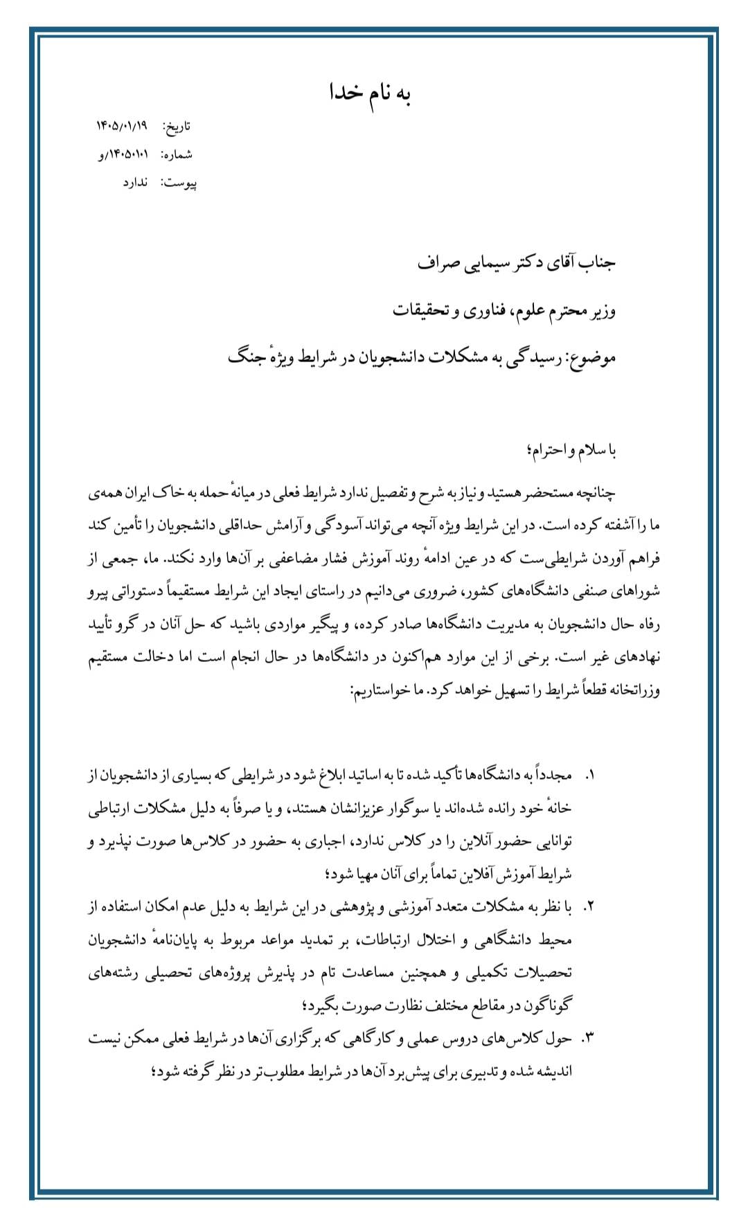 در کنار این موضوع، دانشجویان مجموعهای از درخواستهای آموزشی و رفاهی را نیز مطرح کردهاند. از جمله اینکه مهلت انجام پایاننامهها افزایش یابد و روند پذیرش پروژههای دورههای تحصیلات تکمیلی تسهیل شود تا دانشجویان بتوانند با شرایط فعلی هماهنگتر پیش بروند. آنها همچنین خواستار آن شدهاند که آزمونهای مستمر بهطور موقت برگزار نشود و امتحانات میانترم نیز به زمانی مناسبتر منتقل گردد.