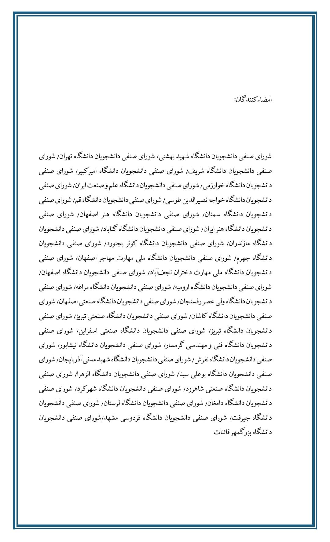 در بخش دیگری از این نامه، دانشجویان درخواست کردهاند که هزینههای مربوط به خوابگاه دریافت نشود، مبالغ پرداختشده بازگردانده شود و برای دانشجویانی که بخشی از شهریه را خود پرداخت میکنند، تخفیفهایی در نظر گرفته شود. علاوه بر این، شوراها بر ضرورت تمدید زمان نیمسال تحصیلی و جبران عقبماندگیهای آموزشی ناخواسته تأکید کردهاند.