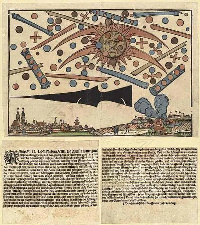 به نظر شما تا چه اندازه ممکن است آسمان نورنبرگ در میانه قرن شانزدهم میزبان یوفوها یا همان بشقاب پرندههای خودمان باشد؟ گزارشها نشان میدهند که برخی از این اجسام به وضوح از فلز ساخته شده بودند و مردم آنها را مثل لولههای تفنگی که به پرواز درآید، توصیف کردهاند. اشیای دیگر نیز به شکل نیزههای سیاه بزرگ ظاهر شدهاند و با سرعتی زیاد در آسمان حرکت میکردهاند.