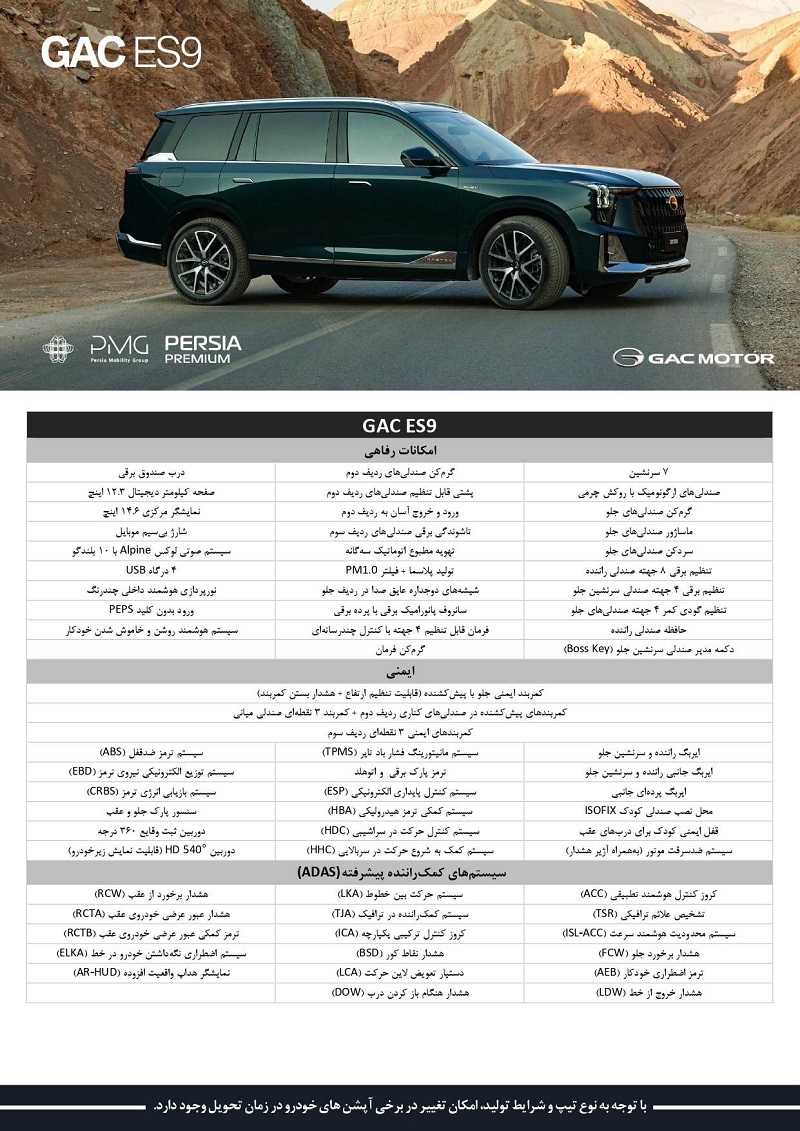 برند GAC یکی از چندین برند فعال در سبد محصولات پرشیا موبیلیتی بوده و کراس اوور ES9 نیز آخرین خودرو آن به حساب میآید که با قیمت گرانی به فروش میرسد. پیش از اینکه وارد اردیبهشت ماه 1405 شویم و متقاضیان بتوانند نسبت به ثبت نام و خرید این محصول اقدام کنند، بد نیست نگاهی به کاتالوگ آن بیندازیم و با زیروبم آن آشنا شویم.