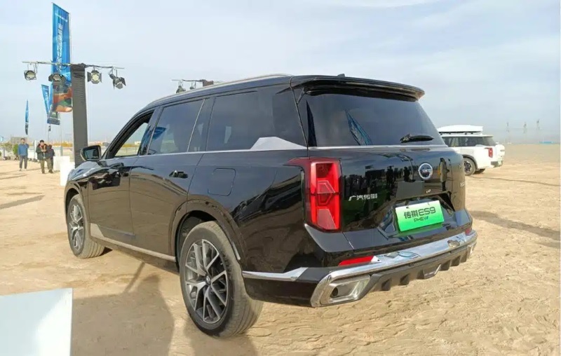 از نمای جانبی میتوان رینگهای 20 اینچی آلومینیومی را مشاهده کرد که خودنمایی میکنند. دستگیرههای در از نوع مخفی شونده هستند تا پروفیل کناری یکدست و تمیز دیده شود. چراغهای جلو اتوماتیک بوده و ارتفاع نوربالای آن به صورت خودکار انجام میشود. یکی از قابلیتهای جذاب چراغهای GAC ES9 خاموشی با تأخیر چراغها پس از قفل کردن دربهاست.