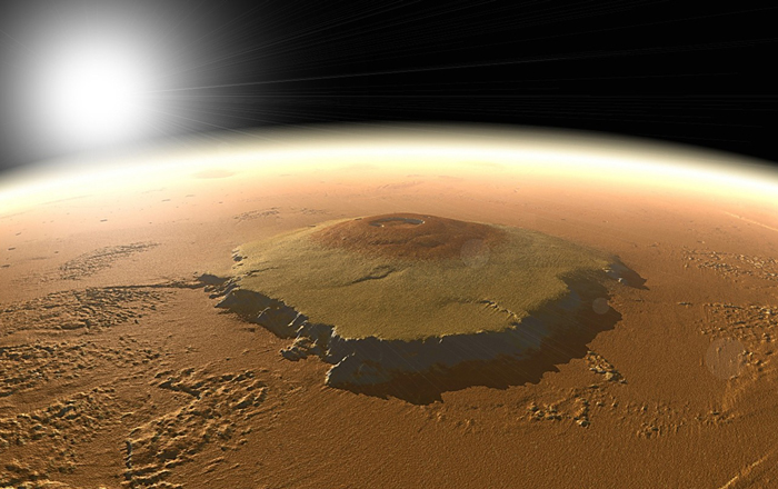 مریخ ممکن است کوچکتر از زمین باشد، اما خانه کوهستانی به مراتب بزرگتر است. المپوس مونز (Olympus Mons) بزرگترین آتشفشان در منظومه شمسی است که تا حدود ۲۱,۲۸۱ متر (تقریبا ۱۳ مایل) بالاتر از سطح مریخ اوج میگیرد. این کوه همچنین از نظر عرض عظیم است و تقریبا ۶۰۲ کیلومتر امتداد دارد. به دلیل ابعاد وسیع و شیبهای تدریجی، فردی که روی سطح آن ایستاده باشد بهراحتی متوجه نمیشود که بر فراز یک کوه قرار دارد.
