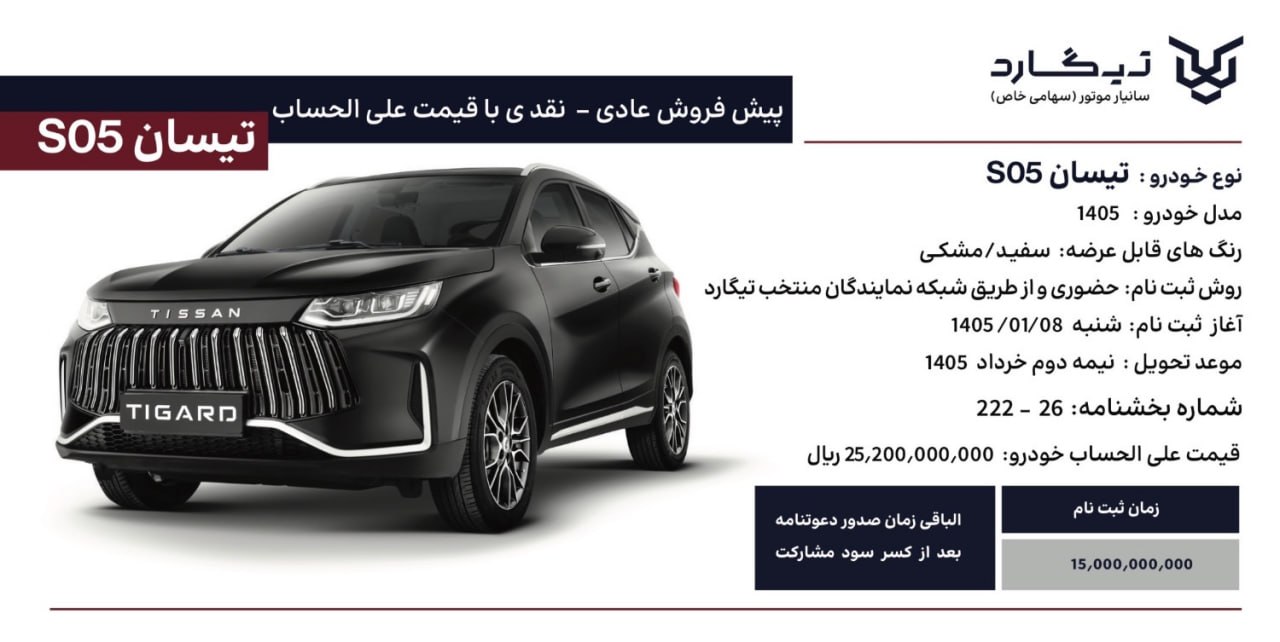- شرایط پیش فروش تیسان S05 تیگارد موتور – فروردین 1405