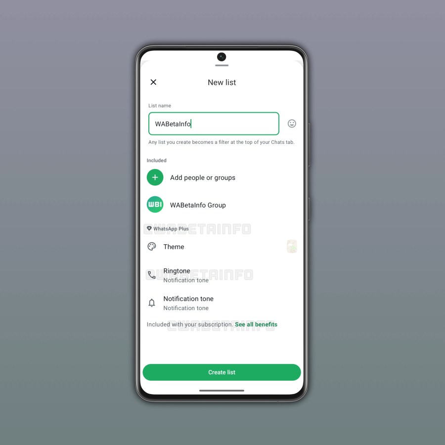 یکی از کاربردیترین ویژگیهای این WhatsApp Plus امکان ساخت لیستهای سفارشی از چتها و گروههاست. کاربر میتواند یک تم خاص را به تمام مکالمات داخل آن لیست اختصاص دهد و با اضافه شدن چت جدید به لیست تم مورد نظر به طور خودکار اعمال خواهد شد.