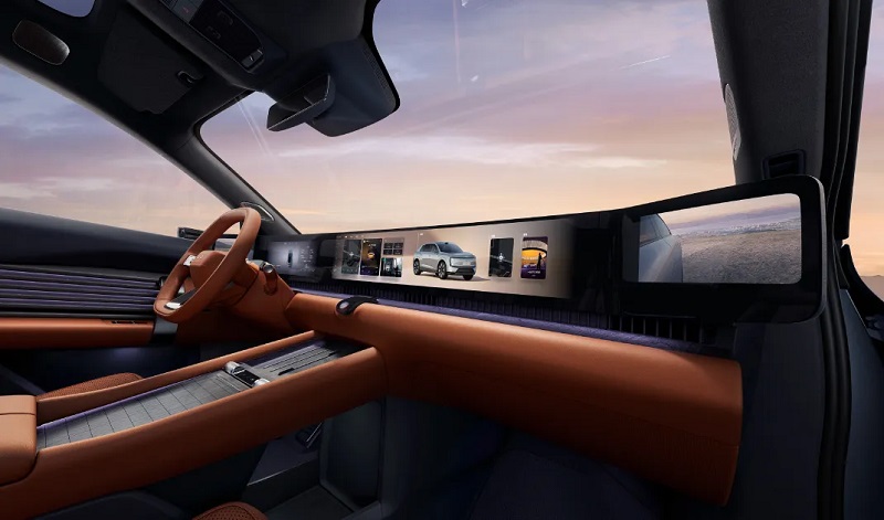 فضای داخلی این خودرو با رویکردی مینیمال اما و فناورانه طراحی شده است. در این زبان طراحی سادگی ظاهری با پیچیدگی تکنولوژیک در هم آمیخته است. در مقابل راننده، یک فرمان با بخش پایینی تخت قرار دارد و روبهرویش یک نمایشگر پانورامیک 4K سرتاسری کشیده شده که تا 59 اینچ امتداد پیدا میکند. این صفحه، نه تنها اطلاعات رانندگی را نمایش میدهد، بلکه در دو سمت خود، تصویر زنده دوربینهایی را نشان میدهد که جایگزین آینههای جانبی شدهاند.