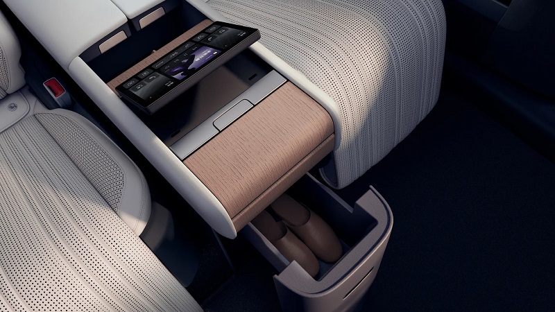 صندلیهای عقب توسط یک کنسول مرکزی شیک از هم جدا شدهاند که هم یک نمایشگر داخلی و هم فضای ذخیرهسازی کاربردی دارد. در پشت کنسول جلو نیز یک محفظه گرمکن و سردکن تعبیه شده تا نوشیدنیها و وسایل کوچک در دمای مناسب نگهداری شوند. برای سرگرمی سرنشینان عقب هم یک نمایشگر 21.4 اینچی از سقف پایین میآید که میتوان آن را با صدا، ریموت یا لمس کنترل کرد.