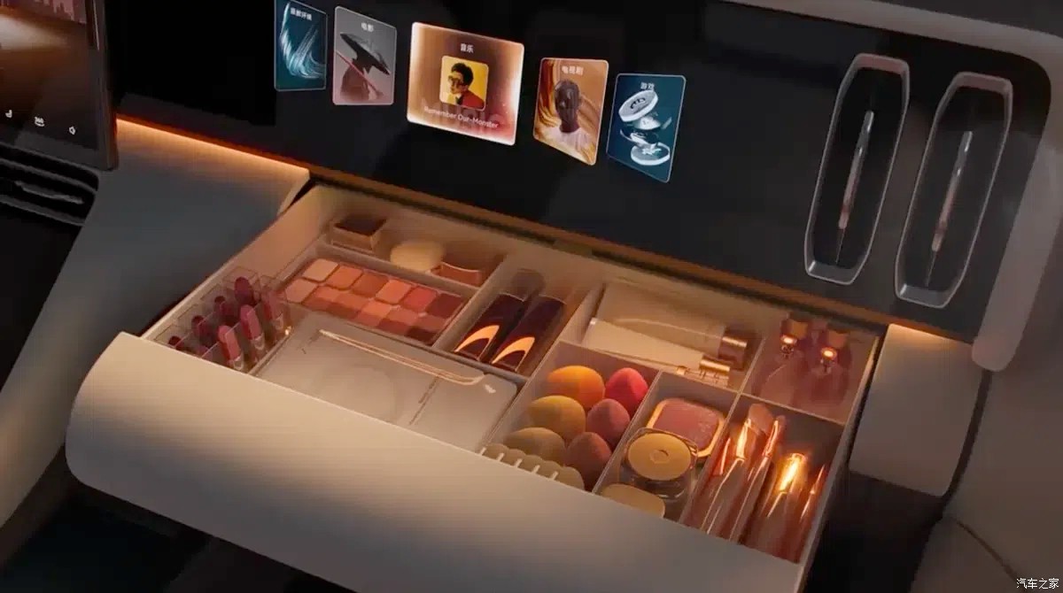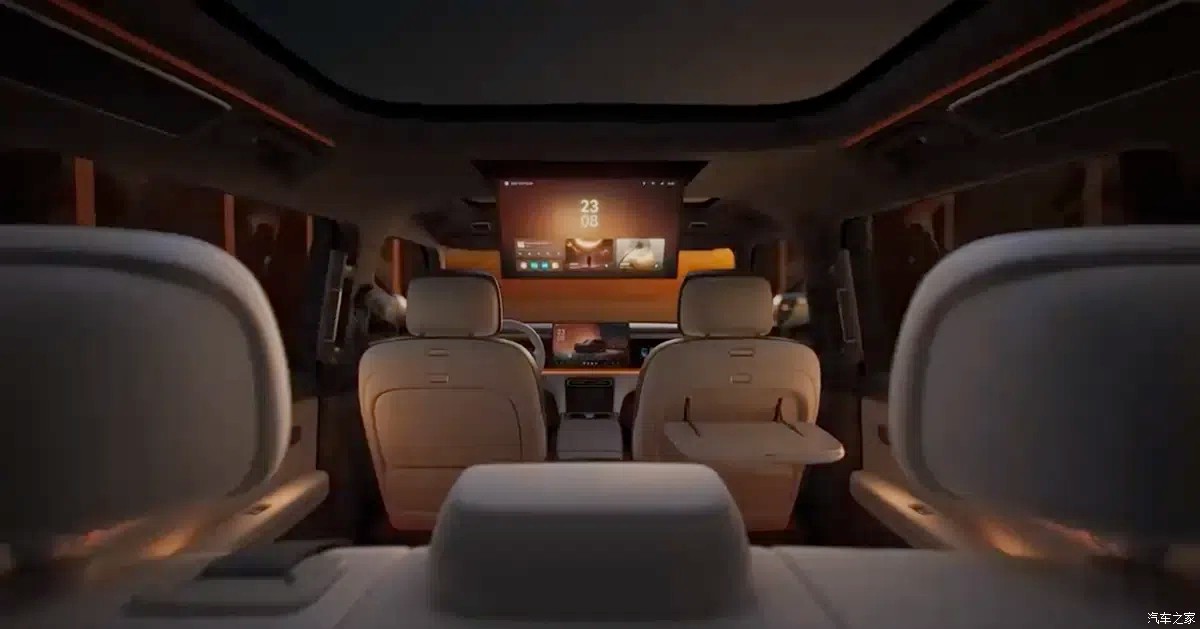 در بخش عقب، یک صفحه نمایش بزرگ سرگرمی و میزهای تاشو تعبیه شدهاند. این خودرو بر اساس طراحی پشتسریهای ردیف دوم، دارای آرایش صندلی ۲+۳+۲ به نظر میرسد.