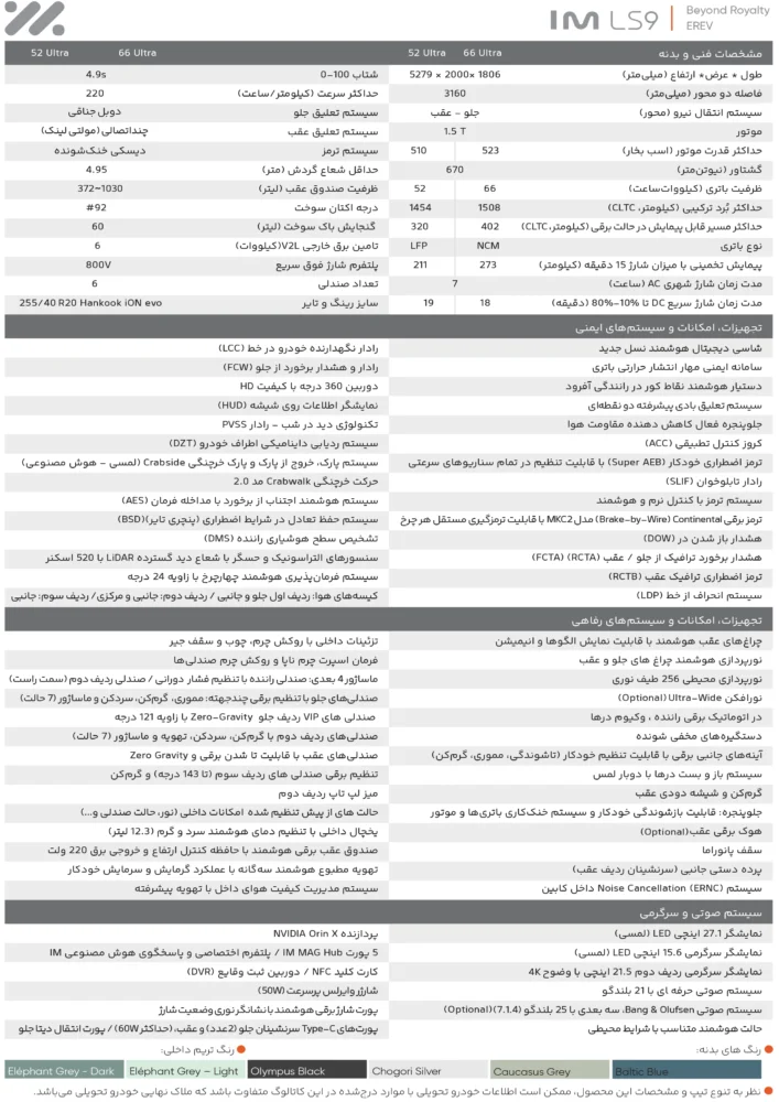 این خودرو که در رده محصولات مدرن قرار میگیرد از فناوری EREV بهره میبرد. در این سیستم پیشرانه بنزینی صرفا نقش ژنراتور را دارد و به چرخها متصل نیست. آی ام LS9 در دو نسخه ۵۲ الترا و ۶۶ الترا عرضه میشود که تفاوت اصلی آنها در ظرفیت باتری و قدرت موتورهای الکتریکی است. تیپ ۶۶ الترا با توان ۵۲۳ اسب بخار و تیپ ۵۲ الترا با ۵۱۰ اسب بخار قدرت عرضه میشوند در حالی که گشتاور هر دو مدل به عدد خیرهکننده ۶۷۰ نیوتن متر میرسد.