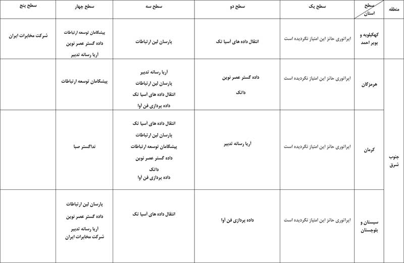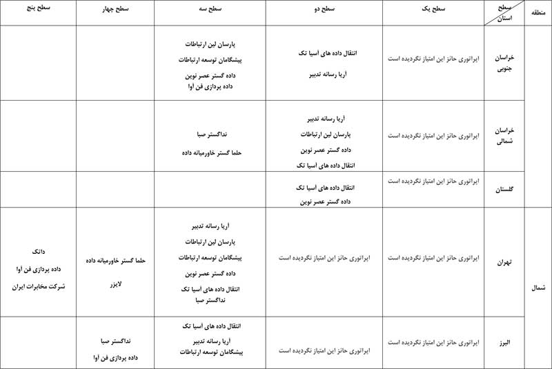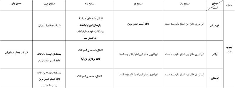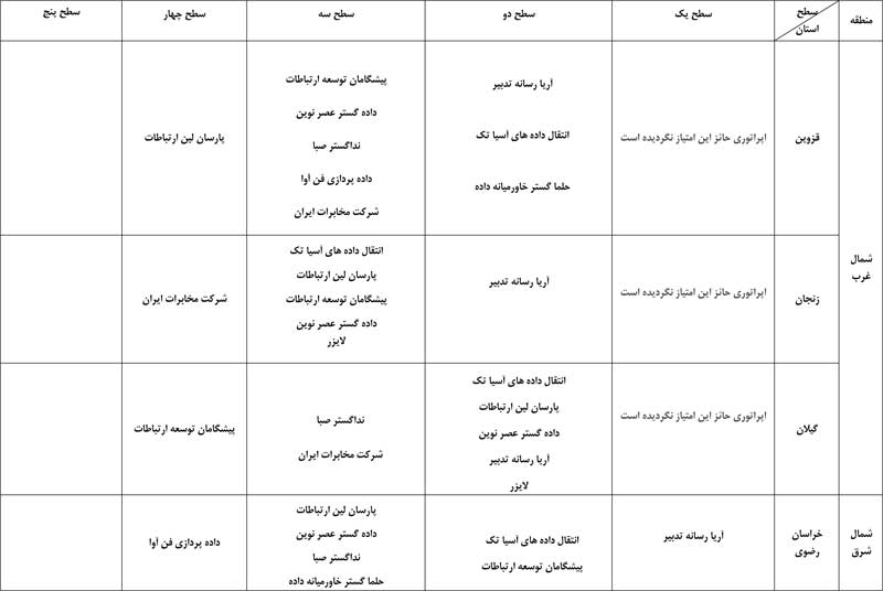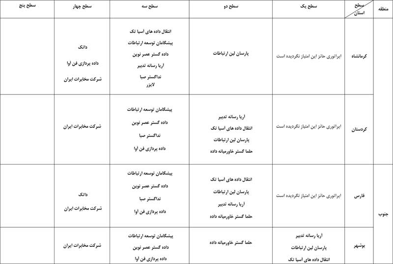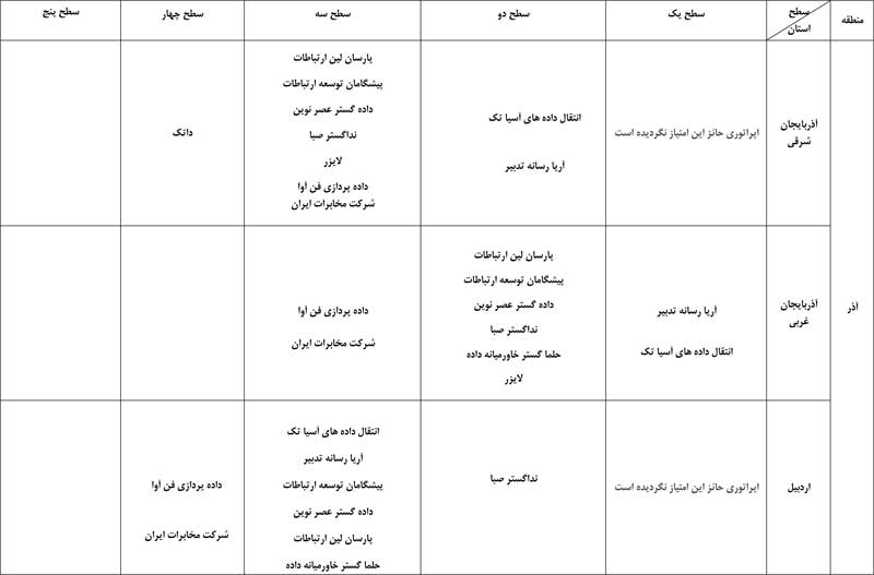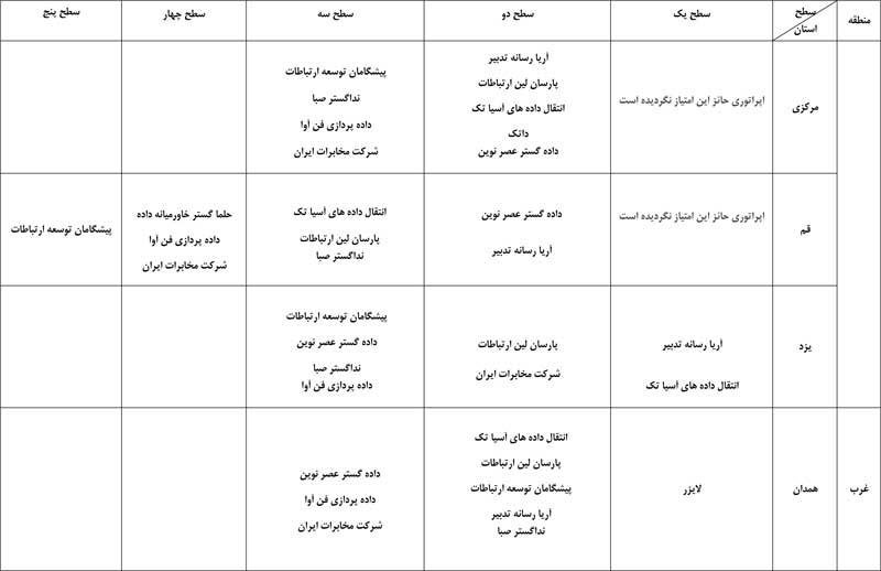 به گفته حسین فلاح جوشقانی، این رتبهبندی به تفکیک استان صورت گرفته و انتشار نتایج نظرسنجی تلفنی از مشترکان اپراتورها همزمان با روشهای الکترونیکی و پیامکی در سال جاری نیز به صورت مستمر ادامه خواهد داشت. بر اساس این نظرسنجی، اپراتورها با توجه به میزان امتیاز رضایت مشترکان در پنج سطح دستهبندی میشوند. امتیازهای 90 تا 100 در سطح یک، 80 تا 90 در سطح دو، 70 تا 80 در سطح سه، 60 تا 70 در سطح چهار و امتیاز 60 در سطح پنج قرار میگیرند. در اینجا جدول بهترین اپراتورهای اینترنت پرسرعت ADSL را به تفکیک استان مشاهده میکنید.