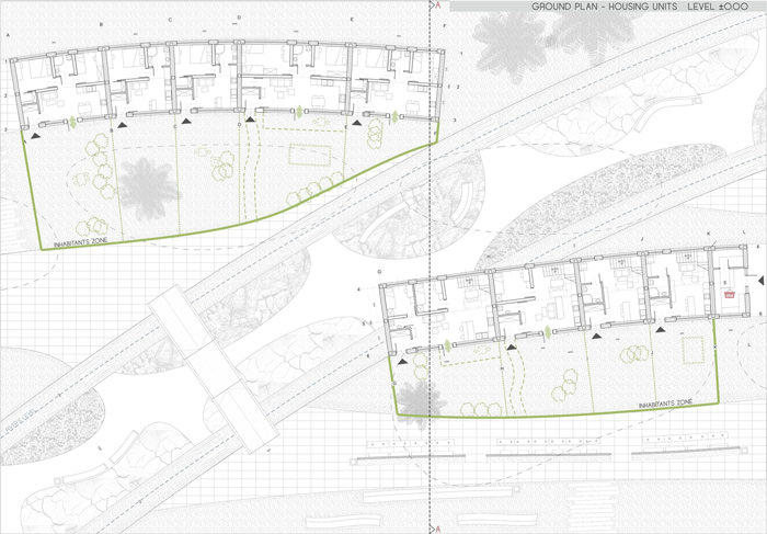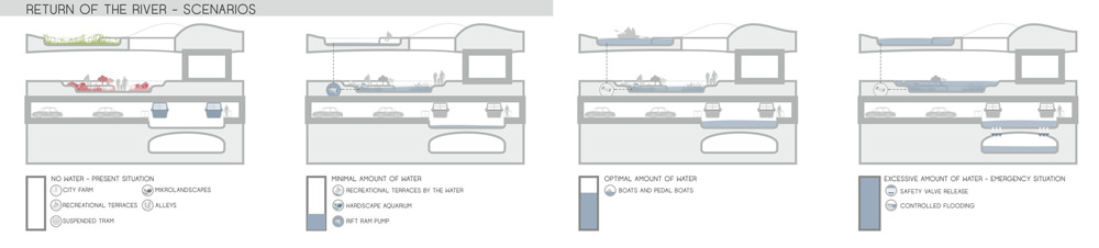 ماتیوس پوزپیچ در این طرح، سیستم پیچیدهای از کانالهای آب را پیشبینی کرده تا در هر شرایطی از جمله پر آبی یا کم آبی، مشکلی برای سازه به وجود نیاید. مسیرهایی بر روی سطح بالایی سازه ایجاد شده که جریان آب از درون آن عبور کرده و برای آبیاری فضای سبز مورد استفاده قرار میگیرد. در صورتی که حجم آب افزایش پیدا کند، جریان آب وارد کانالهای ثانویه در زیر سازه خواهد شد و پس از جریان یافتن در طول سازه، به مخازن تعبیه شده ریخته میشود.