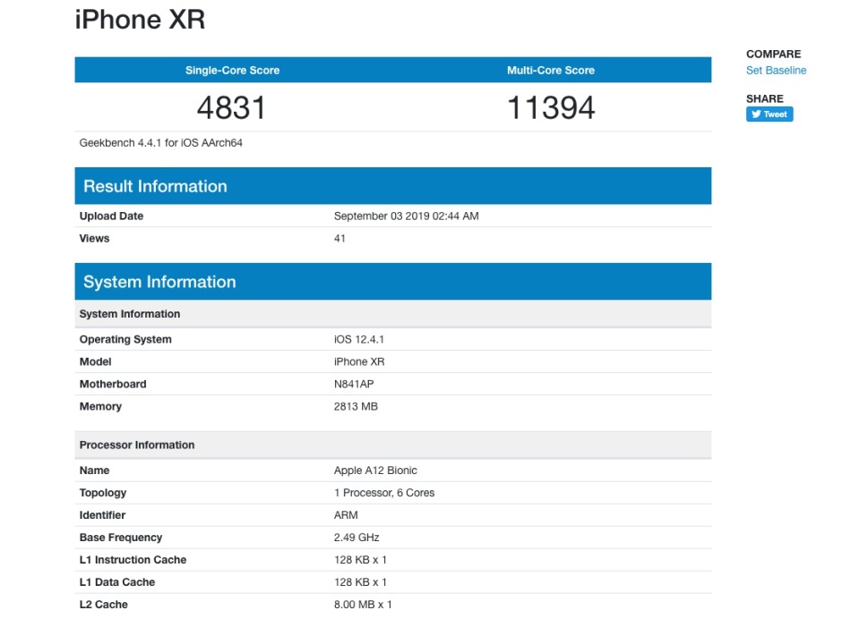 اگرچه در تصویر پایین مستقیما به اسم چیپست A13 اشاره نمیشود، اما کاملا مشخص است با چیزی پیشرفتهتر از آن و چیپستی قویتر از چیزی که بر روی آیفون XR دیدیم مواجه هستیم. این پردازنده شش هستهای دو هسته قدرتمند با سرعت کلاک 2.66 گیگاهرتز خواهد داشت، لازم به ذکر است در نسل قبلی سرعت کلاک 2.49 گیگاهرتز بود. متأسفانه گیکبنچ اطلاعات دقیقتری از چیپ A13 در اختیارمان قرار نداده است، اما میدانیم که این تراشه توسط TSMC و با لیتوگرافی ماوراءبنفش (EUV) برپایه معماری 7 نانومتری طراحی شده تا بازدهی بالاتری داشته باشد.