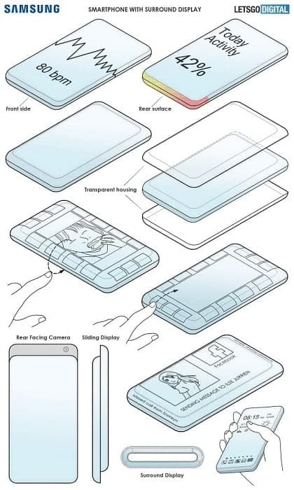 این طرح که اولین بار توسط وبسایت آلمانی LetsGoDigital کشف شد، یک گوشی تمام نمایشگر واقعی است که در اطراف آن نیز نمایشگر قرار دارد. در این گوشی خبری از درگاه، دوربین و دکمه فیزیکی نیست. سامسونگ پتنت این گوشی را ماه جولای گذشته در دفتر پتنت و بازرگانی آمریکا ثبت کرده است. همچنین میتوان آن را در پایگاه اطلاعاتی دفتر دارایی معنوی جهانی نیز یافت. ناگفته نماند اسناد مربوط به این پتنت در 22 اکتبر سال میادی جاری منتشر شدند.