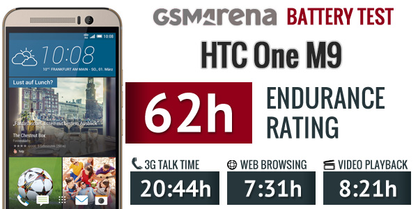 درنهایت، اگر از HTC One M9 روزانه یک ساعت برای وبگردی، یک ساعت برای مکالمه تلفنی و یک ساعت برای تماشای ویدئو استفاده کنید، باتری این تلفن هوشمند برای مدت 62 ساعت (حدود 2 و نیم روز) پاسخگوی شما خواهد بود، در حالی که این رکورد در ام8 به 77 ساعت میرسید.