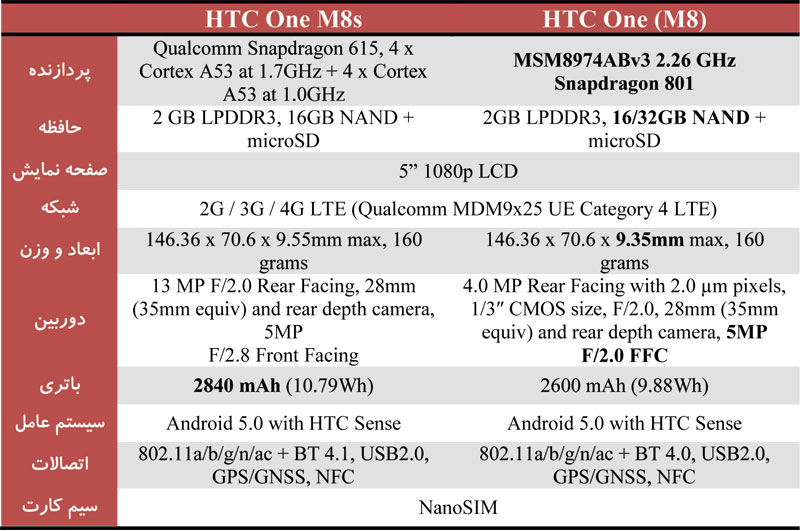 در ادامه جدول مقایسه مشخصات فنی HTC One M8s را با HTC One M8 مشاهده خواهید کرد :