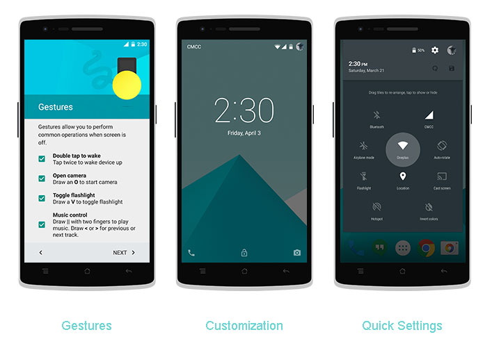 همانطور که پیش از این و همزمان با رونمایی از این رام اختصاصی شاهد آن بودیم این رام اختصاصی و متن باز در واقع تجربهای از اندروید خام را به ما ارائه میدهد که به طور ایدهآل برای سختافزار وان پلاس وان تنظیم شده و حاوی جزئیات و قابلیتهای تدارک دیده شده برای این گوشی هوشمند است.فرامین حرکتی (Gesture) مختلفی در دسترس بوده، منوی میانبرها یا quick settings تغییراتی را به خود دیده و همچنین اپلیکیشن مدیریت فایل تغییر کرده است.