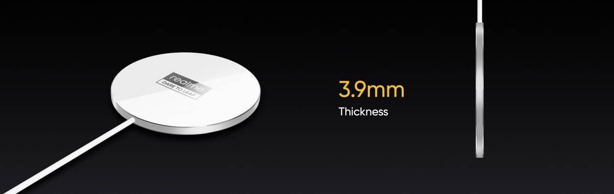 به همین خاطر ریلمی از شارژر مگ دارت ۱۵ وات خود نیز رونمایی کرد. این پد شارژ تنها ۳.۹ میلیمتر ضخامت دارد که باعث میشود حتی از مگ سیف اپل نیز باریکتر باشد. برای رسیدن به این هدف، ریلمی مداربندی دستگاه را در سری کابل USB قرار داده و تنها کویل است که در پد جایگذاری شده است.