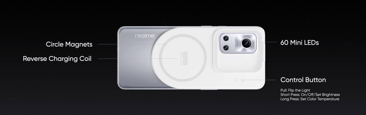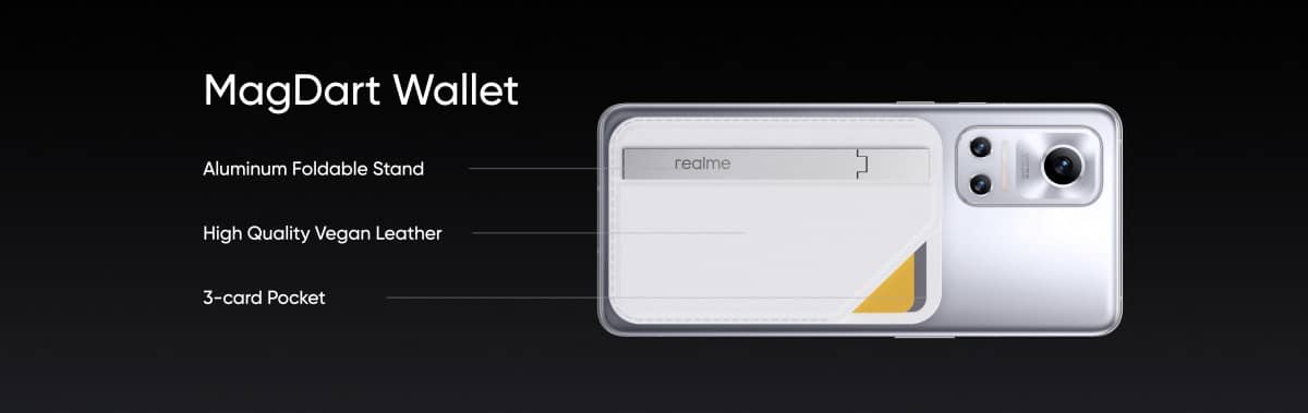 Realme همچنین توجه ویژهای به طراحی این محصول داشته و در ساخت آن از چرم گیاهی و آلومینیوم بهره گرفته است. گیرههای مغناطیسی سیستم MagDart نیز میتوانند به خوبی گوشی را در هنگام استفاده کاربر نگه دارند.